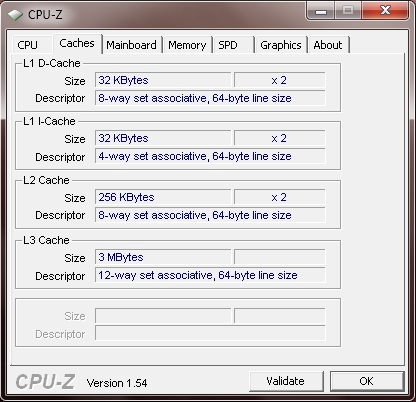Passando alle altre caratteristiche che CPU-Z ci mostra, troviamo le cache L1 (2x32KB+2X32KB rispettivamente per dati e istruzioni), la cache L2 (2x256KB) e la  cache condivisa L3 da 3MB. La mainboard riporta la sigla MS-16G1 ed è dotata di chipset Intel ID0044/HM55.  La memoria ram è configurata in un singolo banco da 2Gb DDR3 funzionante alla frequenza di 1066Mhz CAS 7-7-7-20.